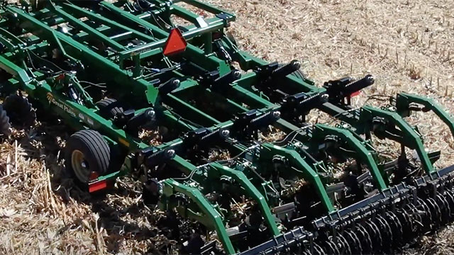 Max-Chisel® works the soil more aggressively than a traditional chisel, but leaves the surface level enough for a single-pass tool to finish the field ahead of the planter in the spring. Angled chopper wheels combine with 15" shank spacing to pull dirt back into the shank voids, leveling the soil while maintaining the vertically-tilled profile left by the shanks.