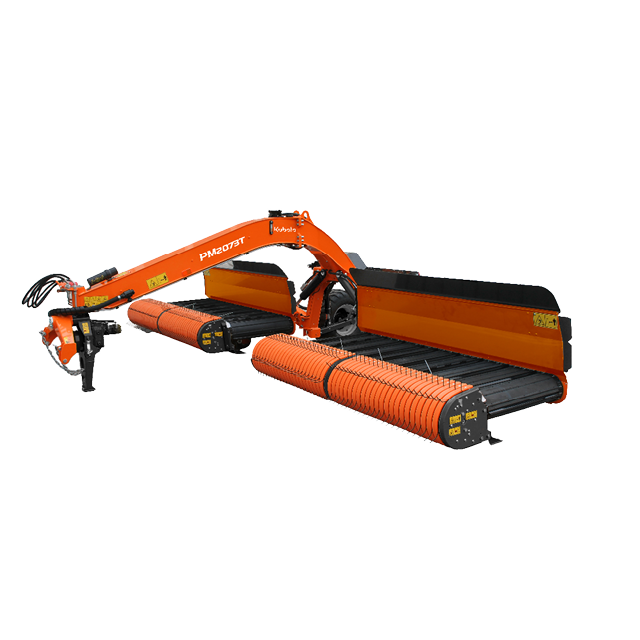 The Kubota PM2073T features two hydraulically adjustable pick-up units for left, right, or centre delivery. It offers excellent suspension to lift crops cleanly, reducing soil contamination. Its six-bar, twin-cam pick-up and reinforced, saw-blade-style belt, handle various silage cuts and crop conditions effectively.